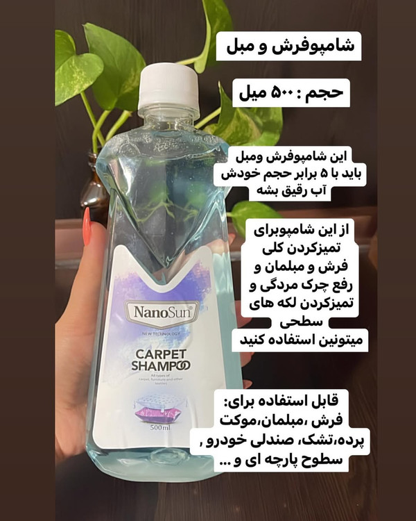 شامپو فرشمون برند نانوسان از کشور المان، حجمش نیم لیتر 500میل و با دو برابر حجم خودش با آب ترکیب میشه و برای همه الیاف طبیعی و مصنوعی مثل فرش دستبافت و ماشینی و موکت و مبلمان و تابلو فرش و گلیم و... استفاده میشه بدون آسیب به بافت به دلیل فاقد مواد مضر، تمامی چرک و کثیفی و لکه هارو از بین میبره وبسیار مقرون به صرفه ست به دلیل غلیط بودن مواد قبل ثبت خرید برای مشاوره ونحوه دقبق استفاده از محصول تماس بگیرید
